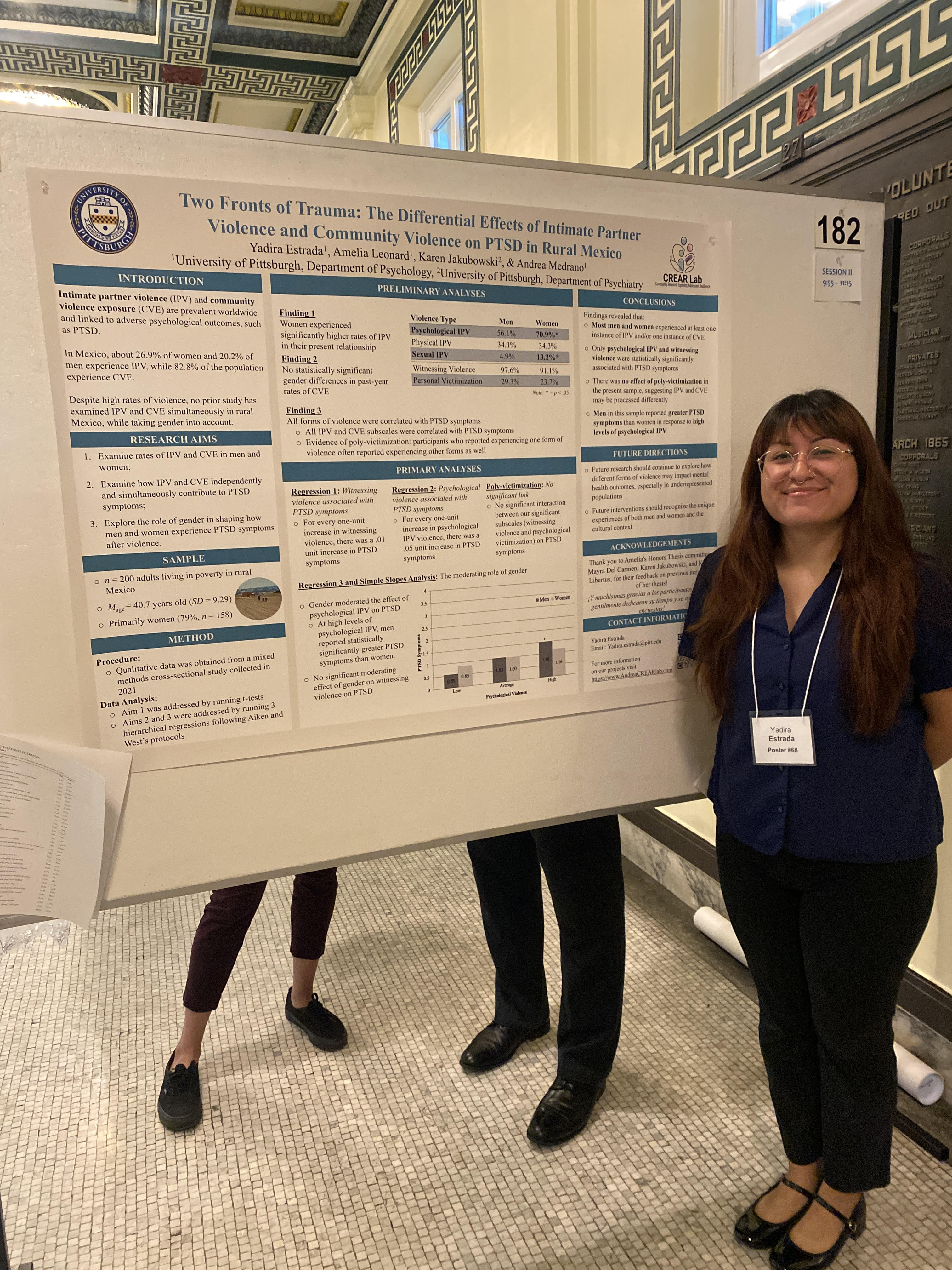 Estrada, Y., Leonard, A. F., Jakubowski, K. P., & Medrano, A. S. (2025, June 12). Two Fronts of Trauma: The Differential Effects of Intimate Partner Violence and Community Violence on PTSD in Rural Mexico [Poster Presentation]. Psychiatry Research Day 2025, Pittsburgh, PA.